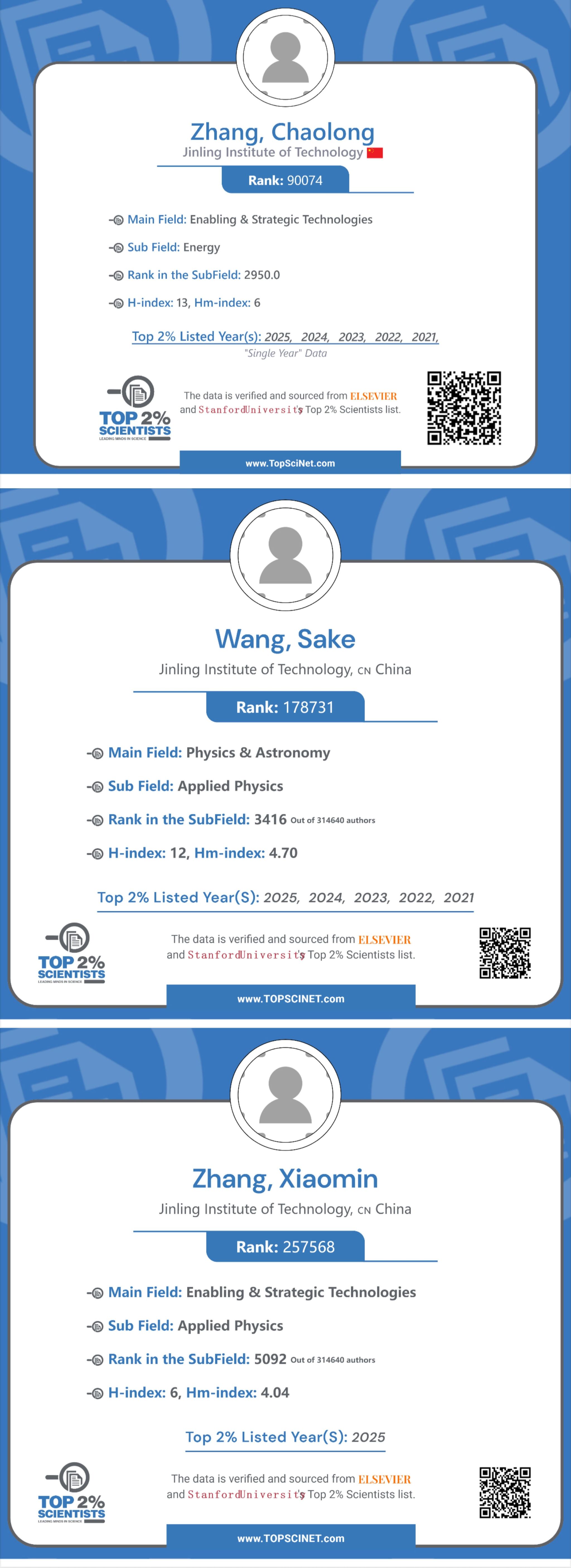 2025年9月19日,美国斯坦福大学(Stanford University)和国际权威学术出版社爱思唯尔(Elsevier)发布了第八版《全球前2%顶尖科学家榜单》。该榜单基于其论文引用数、h因子、合著者修正的hm因子、单独或第一作者的文章引用数等综合参数,遴选出世界排名前2%的科学家,涵盖22个领域和174个子领域。