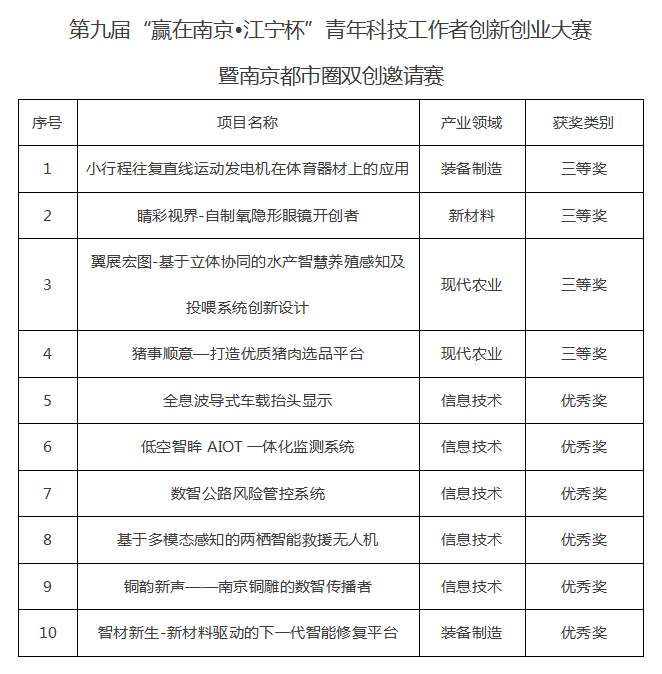 我校10项成果分别在江苏省第10届“科创江苏”创新创业大赛以及南京市第九届“赢在南京•江宁杯”青年科技工作者创新创业大赛暨南京都市圈双创邀请赛中获奖。