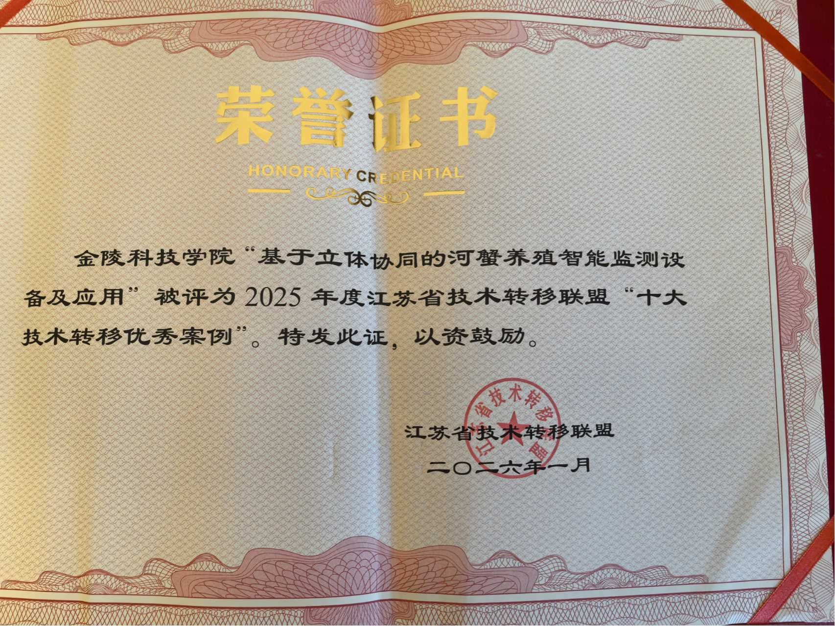 1月30日,2025年江苏省技术转移联盟年会在南京召开,会议对在技术转移工作中表现突出的集体和个人进行表彰。我校继2024年后,再次荣获省内技术转移领域最高奖项——“技术转移工作创新奖”,与南京理工大学、江苏省新质生产力促进中心、南京师范大学等10家单位共同上榜;同时,我校“基于立体协同的河蟹养殖智能监测设备及应用”成功入选2025年度江苏省技术转移联盟“十大技术转移优秀案例”,这是学校首次斩获该类别省级优秀案例奖项,实现综合荣誉与单项案例奖项的双重突破。